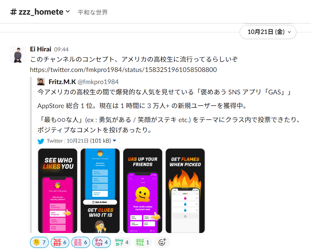 具体的には Slack に [ # zzz_homete ] というチャンネルがありそこで日々褒め合いがあります。ちなみにアメリカの Teenager の間ではお互いを褒め合う GAS というアプリが流行っているらしく、我々は流行を先取りしていたぞ!と社内で話題になりました。笑