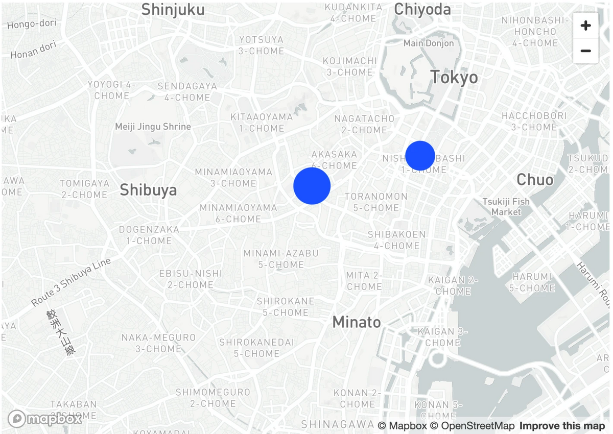せっかくSnowflakeで動かすので、データベースから取得したデータを使う方法も紹介します。下のプログラムはestieが所在していた建物を描画するプログラムです。便利な可視化にするために、開いた時点で世界地図ではなく東京付近の表示とし、マーカーをestieの色にし、大きさをビルの基準階面積に比例させてみました。33,34行目のカラム名を大文字にする必要があります(私は少しこれにハマりました…)。